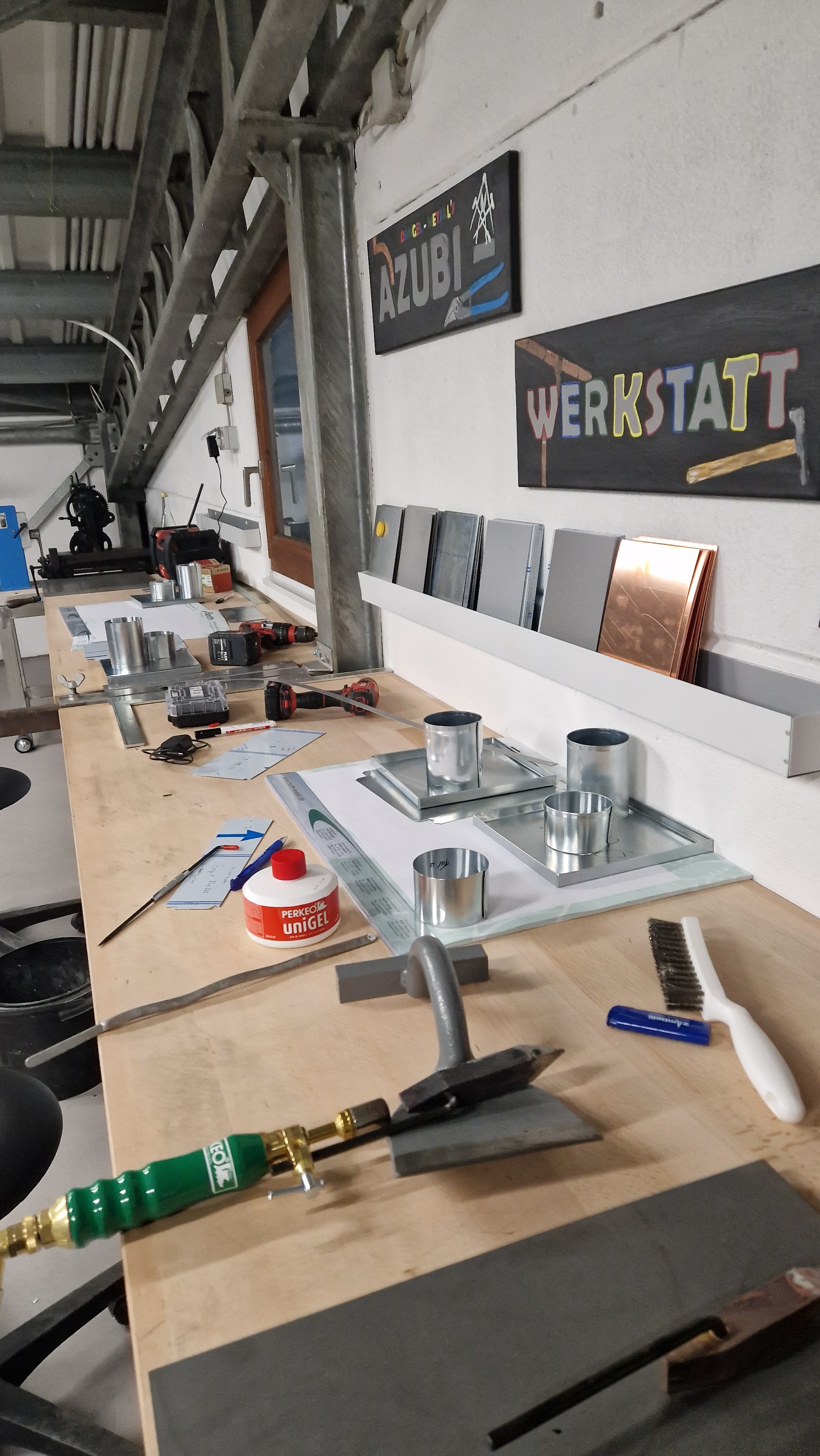 Im Sommer 2025 wurde unsere Juniorchefin Elena Dangel Klempnergesellin, d.h. sie hat damit nicht nur die fachliche Kompetenz erhalten, sondern weiß auch genau, worauf es bei einer Ausbildung ankommt. Somit war ihr erstes Anliegen als Gesellin, nochmal gezielt zu reflektieren, was gut während der Ausbildung lief und was das „i“-Tüpfelchen wäre, um die Ausbildung nochmal zu verbessern bzw. zu optimieren. Gesagt, getan: Die alte Bastelwerkstatt von Senior Gottlieb Dangel war die Grundlage, um daraus eine Azubiwerkstatt zu bauen. Die bestehenden Handmaschinen eignen sich hierbei super, um als Azubi das Handwerk noch so richtig erlernen zu können, ganz ohne digitalen Schnickschnack - denn das ist es, was in der Ausbildung wirklich gefragt ist. Seither konnten schon einige Praktikanten und Azubis darin lernen, basteln und üben. Aber mit der Azubi-Werkstatt soll es das noch nicht gewesen sein. Wir als Dangel-Metall Family werden weiter brainstormen, um die Ausbildung stetig zu verbessern.